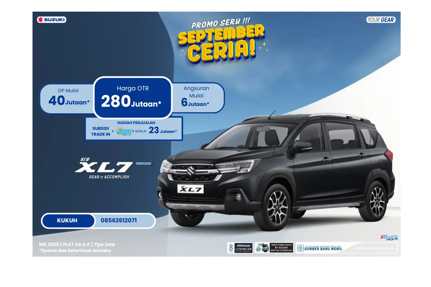 Mencari mobil keluarga yang ideal seringkali menjadi tantangan, apalagi jika harus memilih antara performa tangguh, desain modern, dan harga yang terjangkau. Namun, di bulan September ini, Sumber Baru Mobil Suzuki Cilacap hadir membawa solusi lewat promo "September Ceria" untuk Suzuki XL7. Penawaran spesial ini tidak hanya memudahkan Anda memiliki mobil idaman, tetapi juga memberikan keuntungan berlipat ganda.
