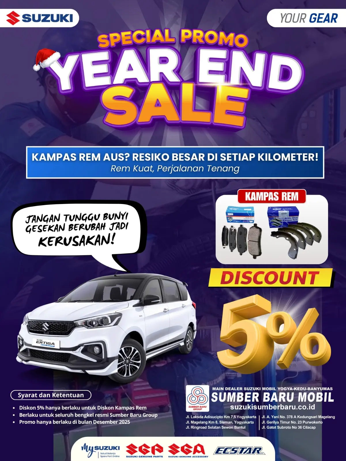 Kabar gembira bagi pemilik mobil Suzuki di Wonosobo! Demi mendukung keselamatan warga di musim liburan ini, Bengkel Resmi Suzuki Sumber Baru Mobil memberikan promo khusus bulan Desember 2025: