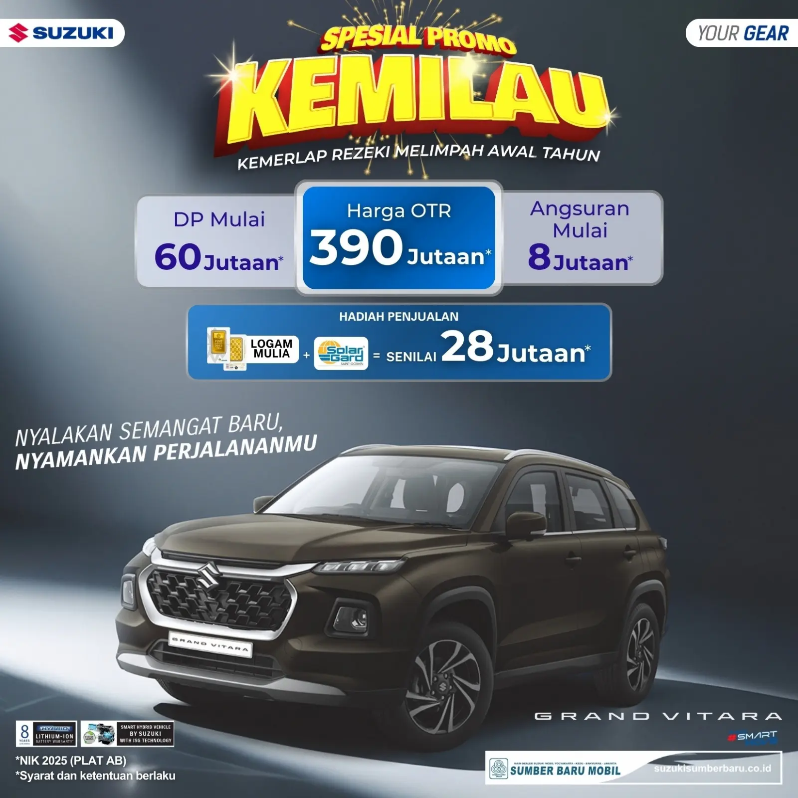 YOGYAKARTA – Mengawali tahun 2026 dengan semangat baru, Suzuki Sumber Baru Mobil kembali menggebrak pasar otomotif Yogyakarta dan sekitarnya. Tidak tanggung-tanggung, melalui program bertajuk "Spesial Promo KEMILAU: Kemerlap Rezeki Melimpah Awal Tahun", dealer resmi Suzuki ini menawarkan kemudahan kepemilikan SUV flagship mereka, Suzuki Grand Vitara.