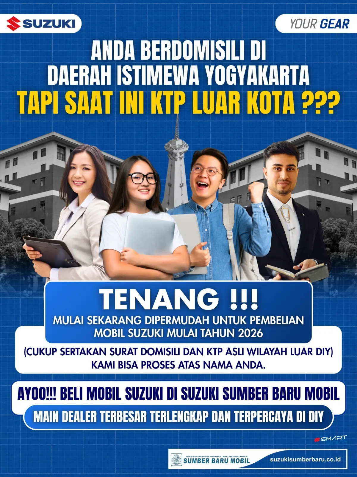 YOGYAKARTA – Kabar gembira bagi masyarakat yang berdomisili di Daerah Istimewa Yogyakarta (DIY) namun masih memegang identitas (KTP) luar kota. Memasuki tahun 2026, Suzuki Sumber Baru Mobil, selaku Main Dealer terbesar di DIY, Kedu, dan Banyumas, resmi mempermudah prosedur kepemilikan unit kendaraan baru.