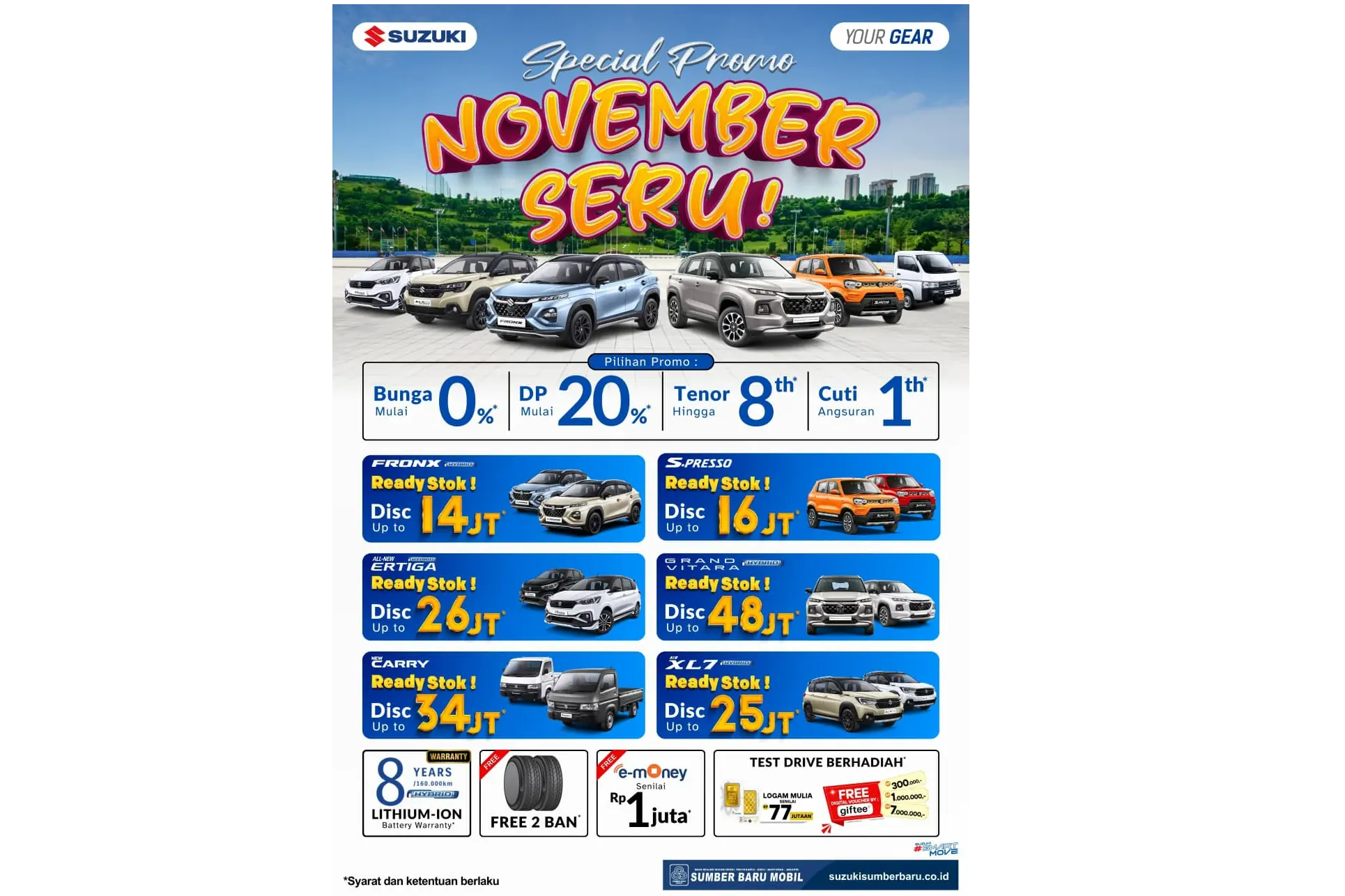 Program promo ini memberikan kemudahan luar biasa bagi Anda untuk membawa pulang Suzuki XL7 Hybrid. Dengan DP mulai dari 40 jutaan dan angsuran ringan mulai 6 jutaan, memiliki mobil impian jadi lebih mudah dari yang Anda bayangkan. Selain itu, ada subsidi trade-in senilai 23 jutaan jika Anda berniat menukar mobil lama Anda. Penawaran ini merupakan solusi cerdas untuk mendapatkan kendaraan yang hemat bahan bakar dan dilengkapi fitur keselamatan modern.