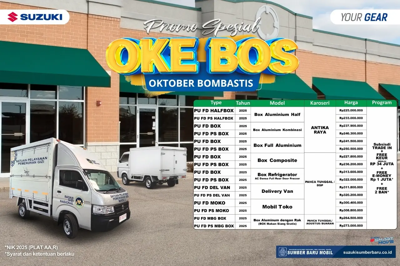 Bagi Anda, para wirausahawan dan pengusaha tangguh di wilayah Kedu, khususnya Banyumas, Cilacap, Kroya, Majenang, Purbalingga, Kroya, Kebumen, Banjarnegara, Wonosobo, Temanggung, Ngadirejo, inilah waktu yang paling tepat untuk mewujudkan atau meng-upgrade armada usaha Anda. Suzuki Sumber Baru Mobil meluncurkan program spesial "OKE BOS - Oktober Bombastis" yang menawarkan keuntungan luar biasa, baik untuk unit New Carry Pick-Up maupun varian Carry Box dengan karoseri khusus.