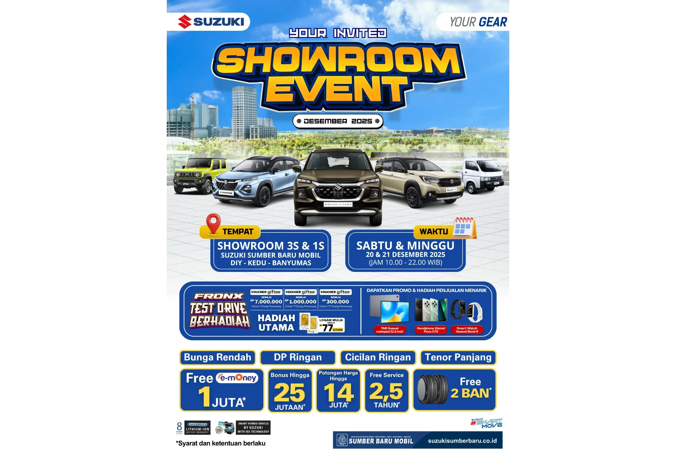 Acara yang dinanti-nanti ini akan berlangsung serentak di seluruh jaringan Showroom 3S & 1S Suzuki DIY, Kedu, dan Banyumas pada akhir pekan ini, Sabtu & Minggu, 20–21 Desember 2025, mulai pukul 10.00 hingga 22.00 WIB.