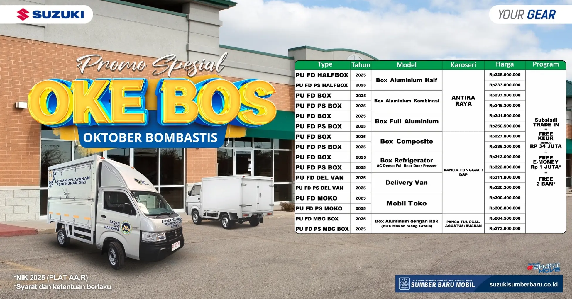 Cilacap – Bulan Oktober 2025 ini, Suzuki Sumber Baru Mobil kembali memanjakan konsumen dengan program spesial OKE BOS – Oktober Bombastis. Program ini ditujukan khusus untuk lini kendaraan niaga andalan, Suzuki New Carry BOX 2025.