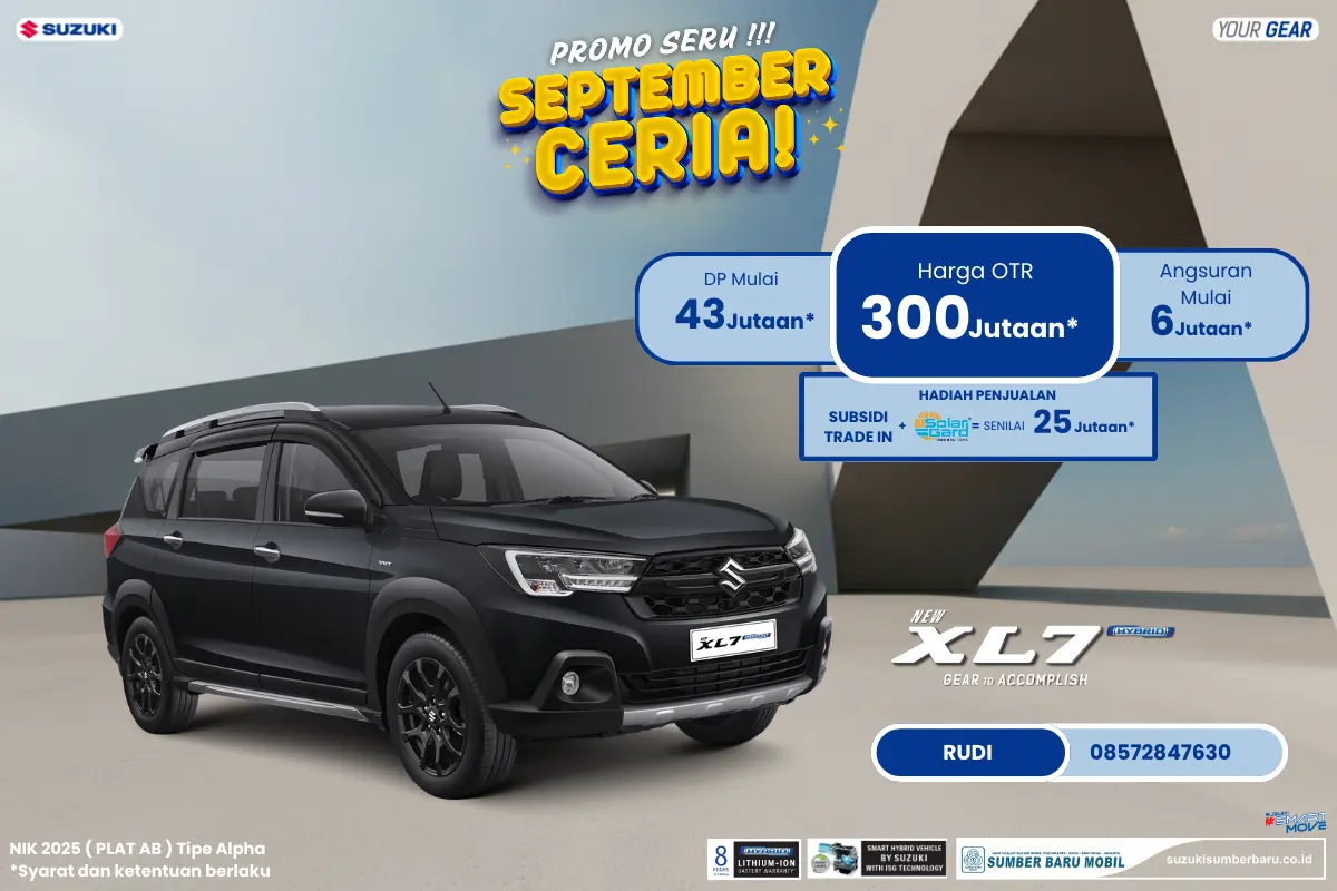 Suzuki Sumber Baru Mobil Mlati menghadirkan Promo September Ceria buat laki-laki dan perempuan usia 25-65+, yang ingin mobil stylish, irit, dan nyaman untuk keluarga. Suzuki XL7 Hybrid tersedia dengan DP mulai 43 Jutaan dan cicilan ringan mulai 6 Jutaan. Harga On The Road cuma sekitar 300 Jutaan*!