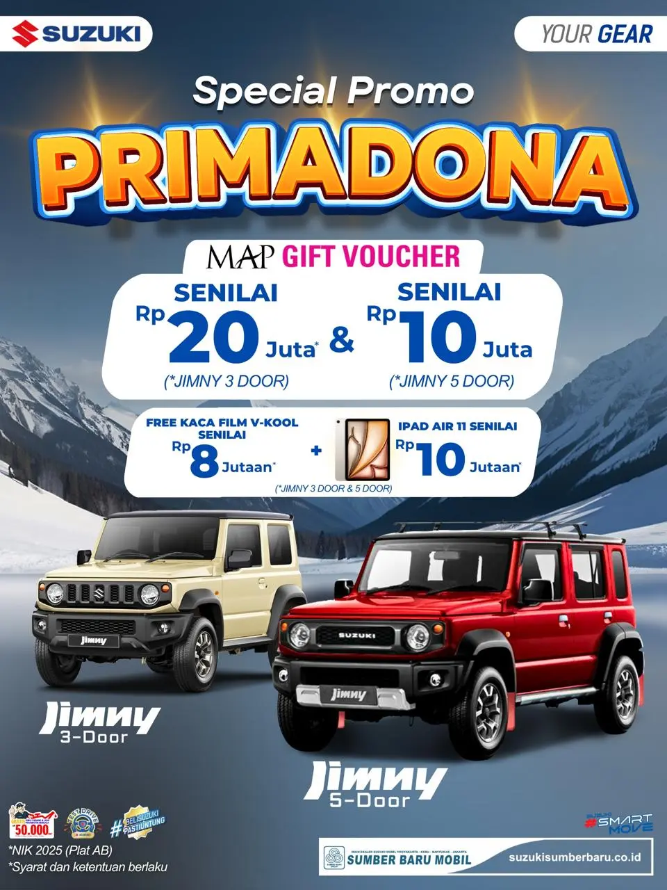 Melengkapi subsidi fleet, Suzuki juga meluncurkan 'Promo Primadona' bagi konsumen retail yang mendambakan Jimny 3D & 5D (khusus transmisi AT Only, Plat AB, NIK 2025). Setiap pembelian akan mendapatkan paket bonus langsung sebagai berikut: