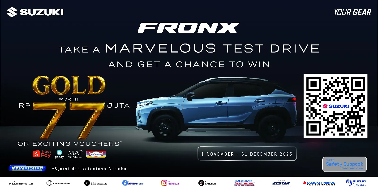 Ya, Anda tidak salah baca. Melalui program "TAKE A MARVELOUS TEST DRIVE", Suzuki Sumber Baru Mobil mengundang Anda untuk merasakan langsung sensasi berkendara SUV Crossover terbaru, Suzuki Fronx, dan memasukkan Anda ke dalam undian berhadiah super fantastis ini.