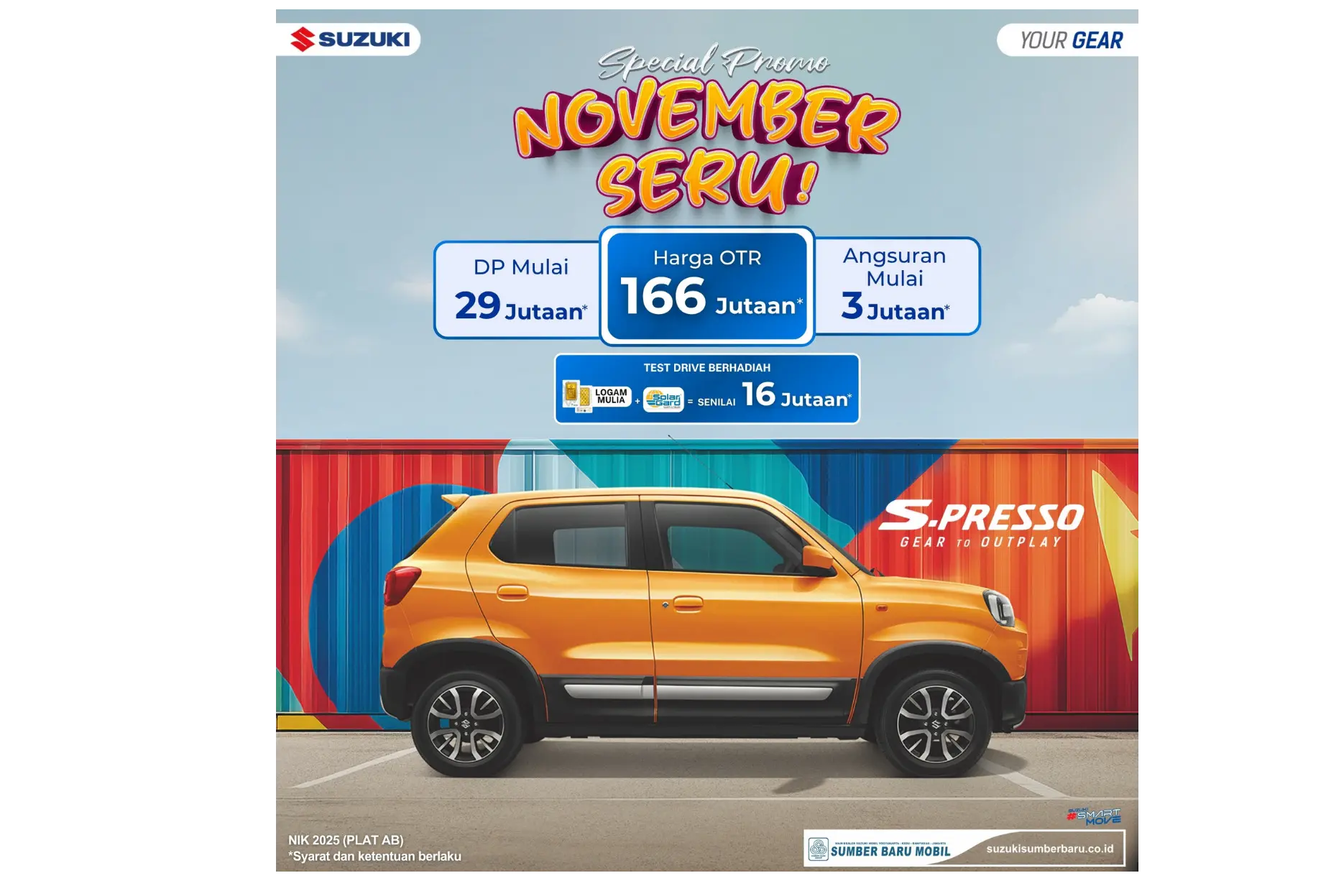 Ingat, promo dengan Total Benefit 47 Juta ini sangat terbatas dan hanya berlaku selama bulan November 2025. Unit ready stock namun berjalan sangat cepat. Segera kunjungi Suzuki Sumber Baru Mobil Laksda (Jl. Laksda Adisucipto Km 7.5) atau hubungi tim marketing kami untuk Test Drive dan pemesanan! Kunjungi juga website resmi kami di https://suzukisumberbaru.co.id/ untuk info lengkap.