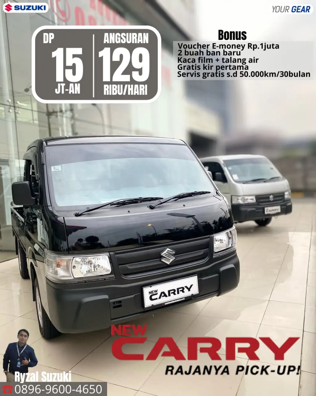 Jika Anda sedang mencari solusi kendaraan niaga yang tangguh, irit, dan ramah di kantong, penawaran ini wajib Anda simak. Bayangkan, dengan DP (Down Payment) hanya 15 Juta-an dan angsuran super ringan, mulai dari Rp 129 Ribu per hari, Anda sudah bisa membawa pulang unit New Carry terbaru untuk mendongkrak operasional bisnis Anda!