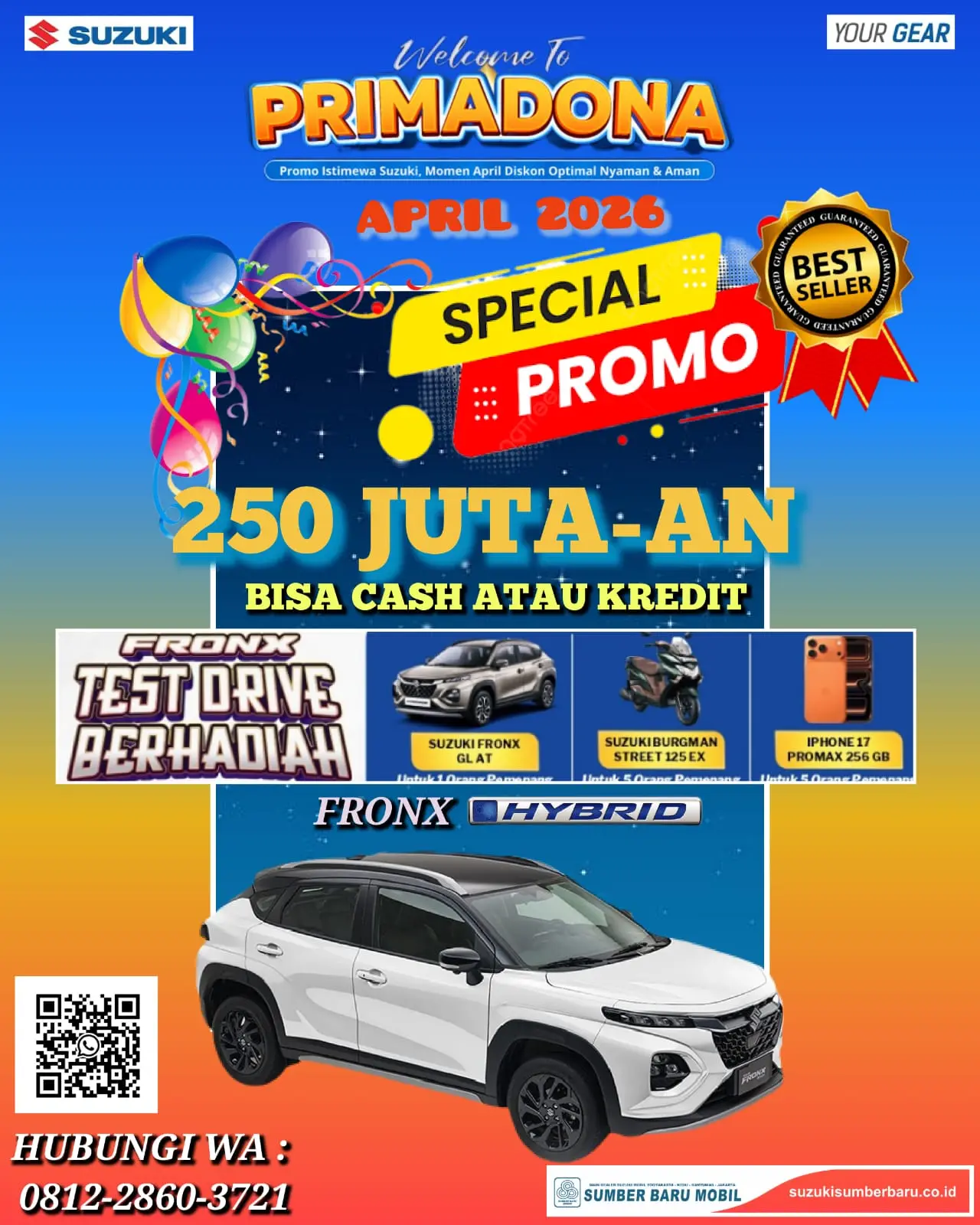 "Awalnya cuma mau lihat-lihat, tapi pas tahu ada promo April 2026 dan bisa test drive berhadiah iPhone, saya langsung SPK Suzuki Fronx Hybrid. Prosesnya cepat, marketingnya sangat membantu, dan harganya jujur paling oke di Bantul!" — Bapak Aris, Wiraswasta di Bantul.