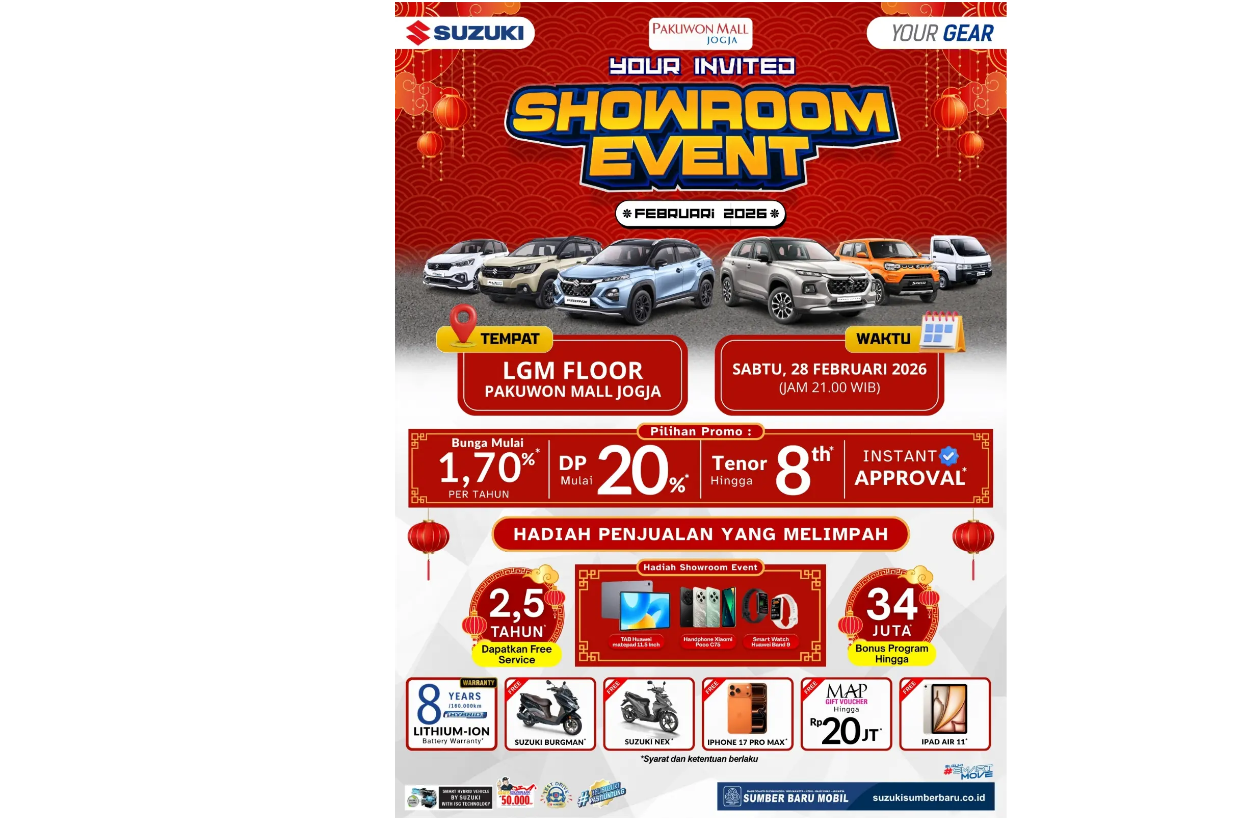 Suzuki Indonesia melalui Sumber Baru Mobil resmi menggelar Handover Ceremony Suzuki Fronx di Soiree Lounge & Grill by Marriott Hotel, Yogyakarta. Acara eksklusif ini menjadi penyerahan perdana 50 unit pertama Suzuki Fronx kepada para pelanggan setia yang telah melakukan pemesanan sejak peluncuran awal.