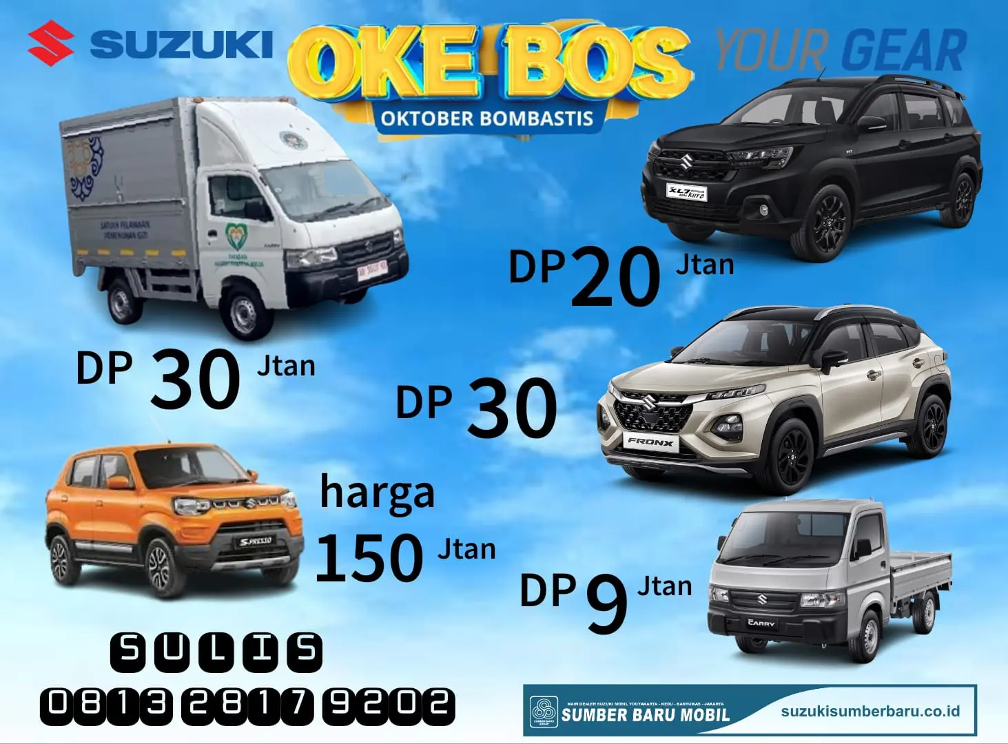 Warga Bantul dan sekitarnya, siapkan diri Anda untuk kejutan terbesar di bulan Oktober! Suzuki Sumber Baru Mobil Bantul resmi meluncurkan program "OKE BOS: Oktober Bombastis" yang menawarkan solusi kepemilikan mobil untuk segala kebutuhan—mulai dari mobil niaga, city car irit, hingga SUV stylish—dengan skema Down Payment (DP) yang super ringan dan harga yang "Bikin Gempar!"