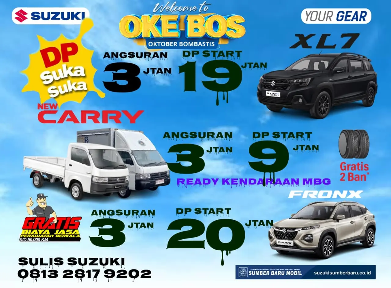 Kesempatan emas untuk memiliki mobil Suzuki impian telah tiba di Suzuki Sumber Baru Mobil Bantul! Bulan ini, Suzuki menggebrak dengan Promo OKE BOS (Oktober Bombastis), sebuah penawaran yang dirancang khusus untuk memenuhi kebutuhan mobilitas keluarga (usia 25-65+) sekaligus mendukung perkembangan usaha Anda.