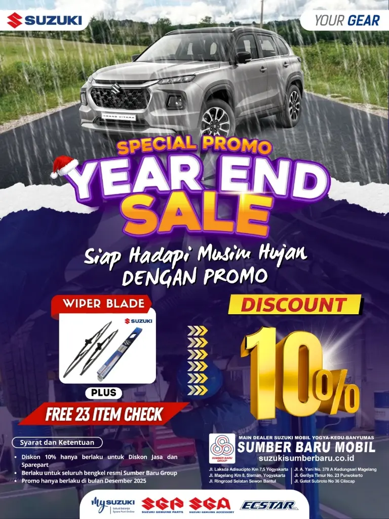 Kondisi ini tentu berbahaya, terutama bagi warga yang mobilitasnya tinggi melintasi jalur industri atau jalur lintas selatan. Demi menjaga keselamatan warga Cilacap, Suzuki Sumber Baru Mobil melalui cabangnya di Jl. Gatot Subroto meluncurkan program spesial "Year End Sale".