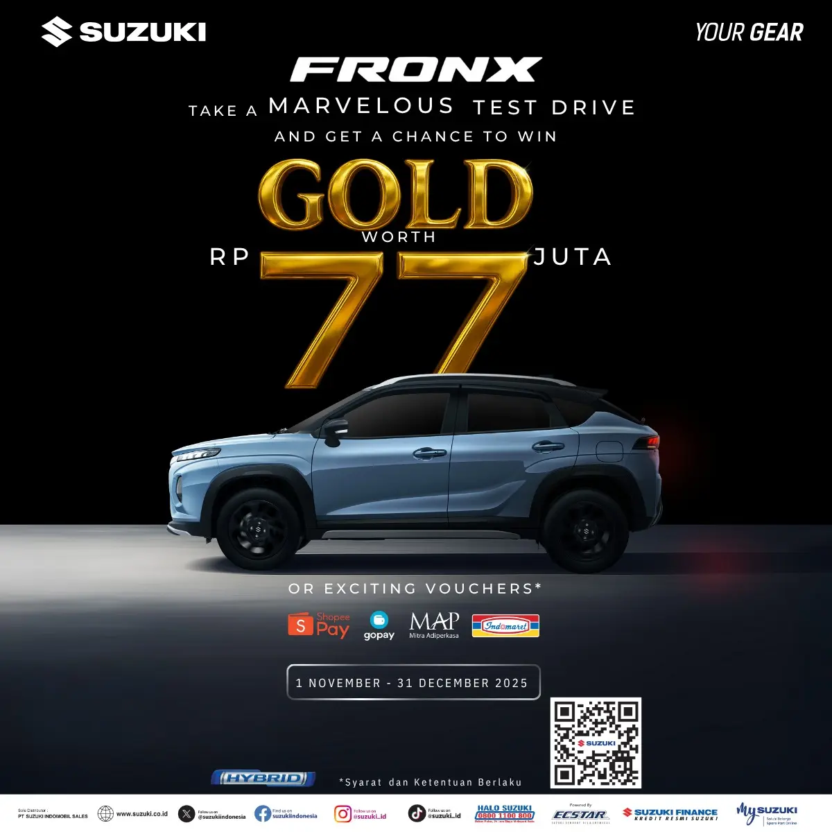 Bayangkan, hanya dengan mencoba kecanggihan dan kenyamanan SUV Crossover terbaru, Suzuki Fronx, Anda berkesempatan membawa pulang EMAS SENILAI TOTAL 77 JUTA RUPIAH! Ya, Anda tidak salah baca. Ini bukan undian pembelian, tapi undian test drive!