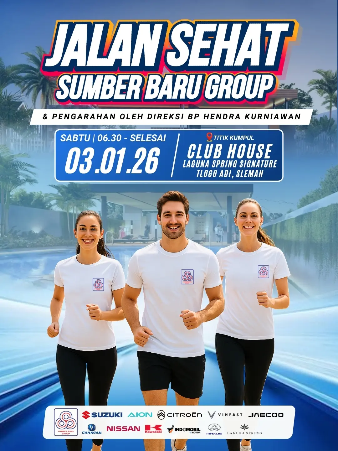 Sleman – Mengawali tahun 2026 dengan semangat positif, Sumber Baru Group menggelar kegiatan Jalan Sehat yang akan dilaksanakan pada Sabtu, 3 Januari 2026, bertempat di Club House Laguna Spring Signature, Tlogo Adi.