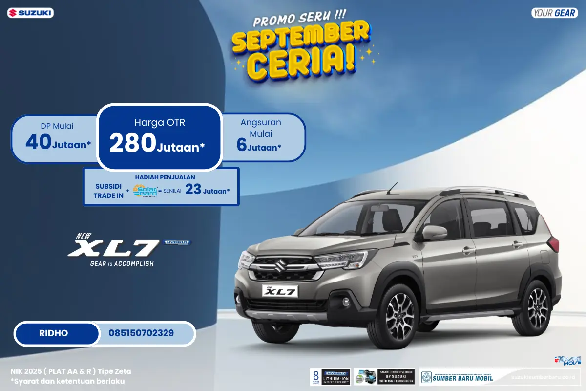 Dalam program promo "September Ceria" ini, Anda bisa memiliki Suzuki XL7 Hybrid dengan skema pembayaran yang sangat ringan. Cukup siapkan DP mulai 40 jutaan dan nikmati angsuran ringan mulai 6 jutaan. Penawaran ini sangat menguntungkan, terutama bagi Anda yang ingin beralih ke kendaraan yang lebih hemat bahan bakar dan ramah lingkungan.