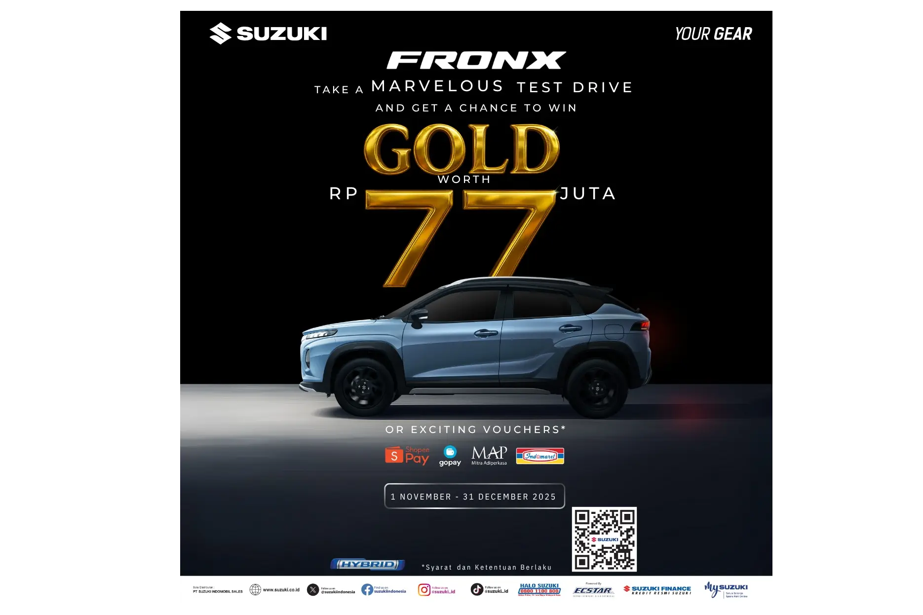Kabar baiknya, "Flash Sale 11.11" untuk Suzuki Fronx ini berlaku di SEMUA CABANG Suzuki Sumber Baru Mobil di wilayah Yogyakarta, Kedu, dan Banyumas. Bagi Anda yang mencari promo Suzuki Jogja, diskon Fronx Sleman (Jamal), harga Fronx Bantul, kredit Fronx Wonosari, promo 11.11 Magelang, diskon Suzuki Tegalrejo, promo Purworejo, harga Suzuki Kroya, Fronx Cilacap, atau promo Suzuki Purwokerto, HARI INI adalah hari keberuntungan Anda!