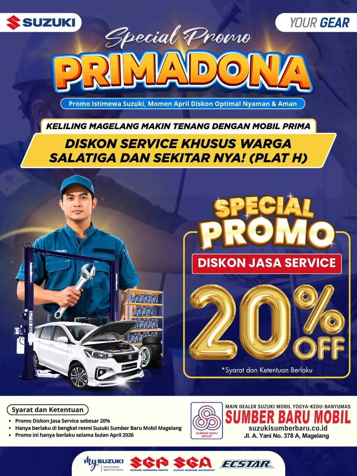 MAGELANG – Menjaga performa kendaraan tetap prima kini jauh lebih hemat. Mengawali bulan April 2026, Suzuki Sumber Baru Mobil Magelang resmi meluncurkan program "Promo Primadona" (Promo Istimewa Suzuki, Momen April Diskon Optimal Nyaman & Aman).