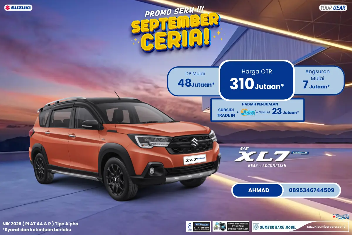 Di tengah kesibukan sehari-hari, memiliki kendaraan yang dapat diandalkan adalah kebutuhan. Suzuki XL7 hadir sebagai jawaban sempurna bagi Anda yang mendambakan mobil tangguh, efisien, dan penuh gaya. Khusus di bulan September ini, Sumber Baru Mobil Suzuki Cilacap memberikan penawaran istimewa melalui promo "September Ceria" yang dirancang untuk memberikan kemudahan ekstra bagi para calon pembeli.