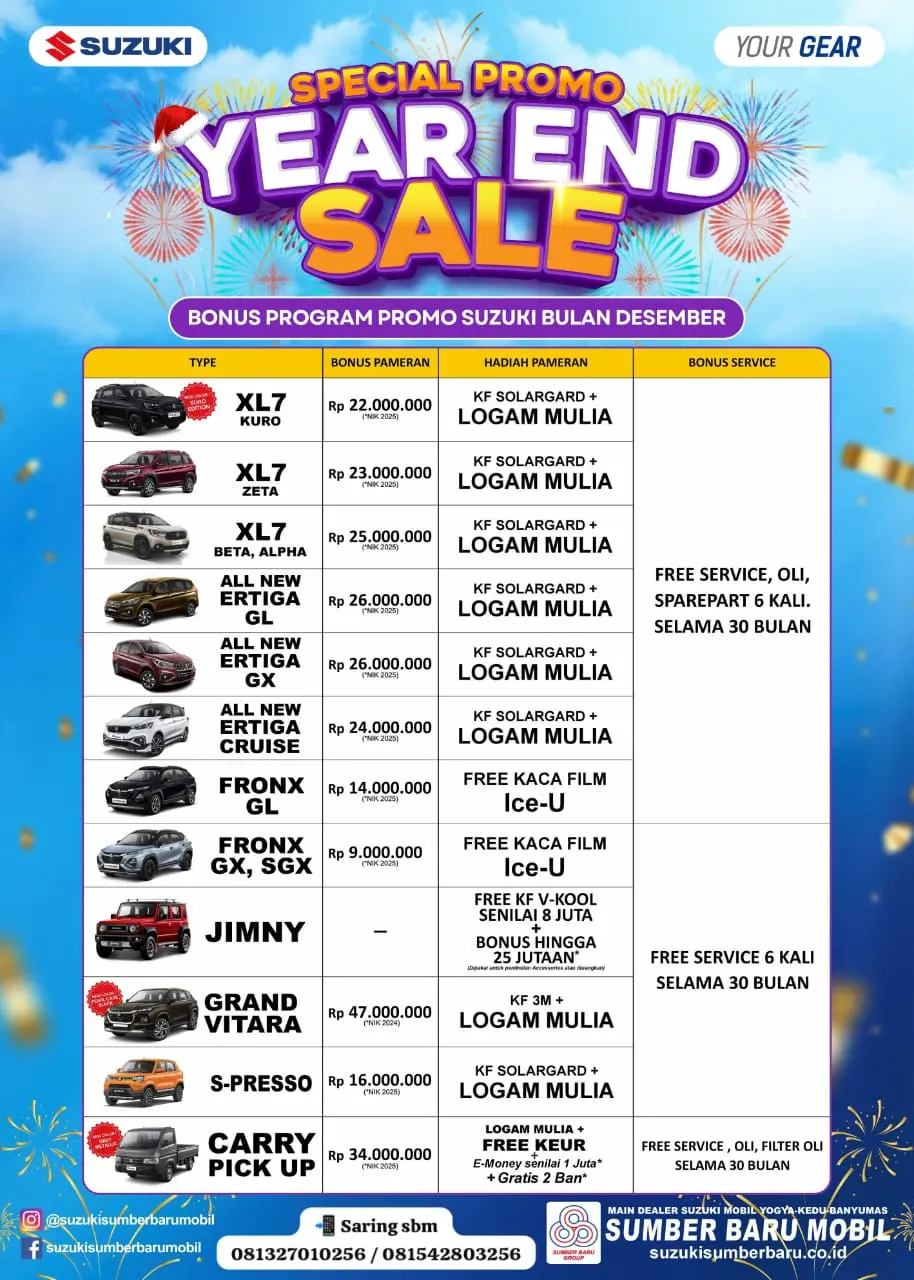 MAJENANG – Menutup lembaran tahun 2024, Suzuki Sumber Baru Mobil memberikan kejutan spesial bagi masyarakat Majenang dan sekitarnya. Melalui program bertajuk "Year End Sale", dealer resmi Suzuki ini siap memanjakan konsumen dengan pesta diskon dan hujan hadiah yang belum pernah ada sebelumnya.