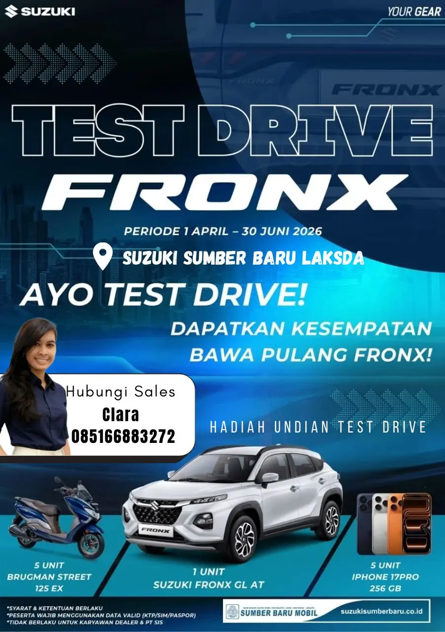 Testimoni Konsumen: "Awalnya cuma penasaran sama bentuk Fronx yang gagah. Pas coba test drive di Suzuki Laksda, ternyata setirnya enteng banget dan kabinnya senyap. Pelayanannya ramah, prosesnya cepat, dan siapa tahu rejeki dapet iPhone atau malah mobilnya!" – Bapak Aris (42), Pengusaha di Yogyakarta.