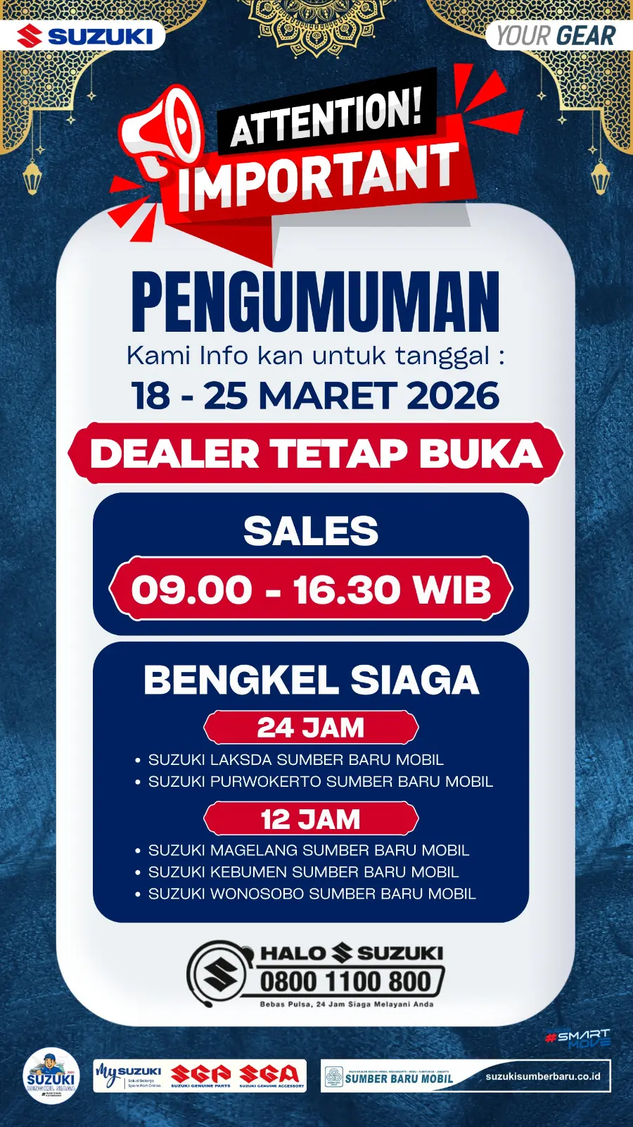 Layanan Sales (Penjualan): Showroom tetap terbuka bagi Anda yang ingin berkonsultasi mengenai unit terbaru seperti Suzuki Jimny atau All New Ertiga Hybrid, mulai pukul 09.00 – 16.30 WIB.
