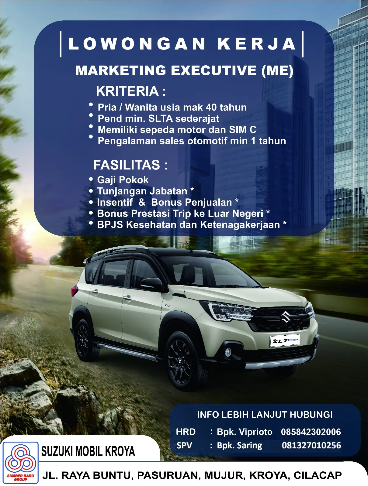 MAJENANG – Pesatnya pertumbuhan ekonomi di wilayah Majenang dan sekitarnya membuat kebutuhan masyarakat akan kendaraan niaga dan penumpang semakin tinggi. Menjawab tantangan ini, Suzuki Sumber Baru Mobil Cabang Majenang membuka kesempatan kerja terbaru bagi talenta lokal untuk mengisi posisi Marketing Executive (ME).