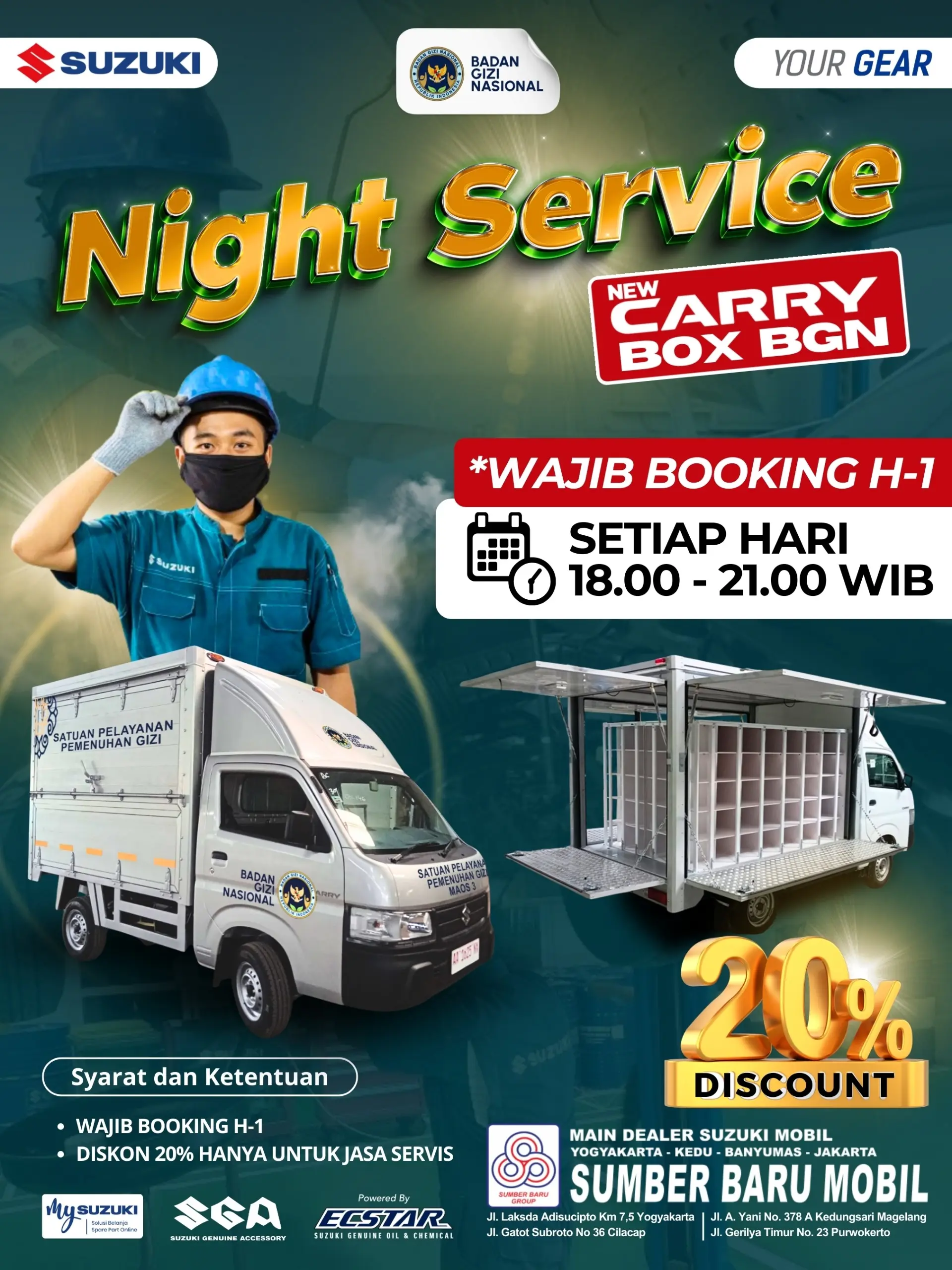 Selain kemudahan waktu, Suzuki juga memberikan diskon 20% khusus jasa servis selama program Night Service berlangsung. Dengan promo ini, konsumen bisa lebih hemat dalam biaya perawatan sekaligus menjaga keandalan kendaraan agar tetap optimal digunakan untuk operasional bisnis.