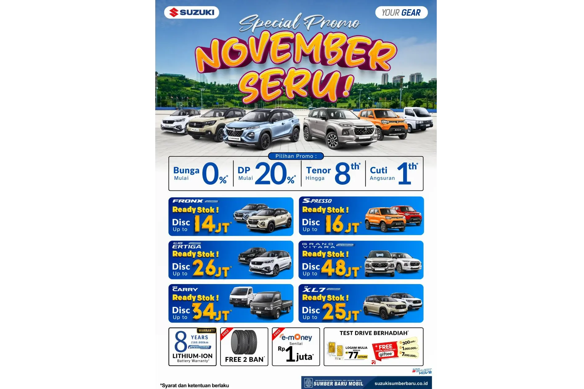 PURBALINGGA, SUZUKISUMBERBARU.CO.ID – Kabar paling "SERU" dan mengejutkan datang untuk para pecinta otomotif dan petualang di Purbalingga! Di bulan ini, Dealer Suzuki Purbalingga (Sumber Baru Mobil) secara resmi merilis program "SPECIAL PROMO NOVEMBER SERU!" untuk unit yang paling dicari-cari: Suzuki Jimny 5-Door.