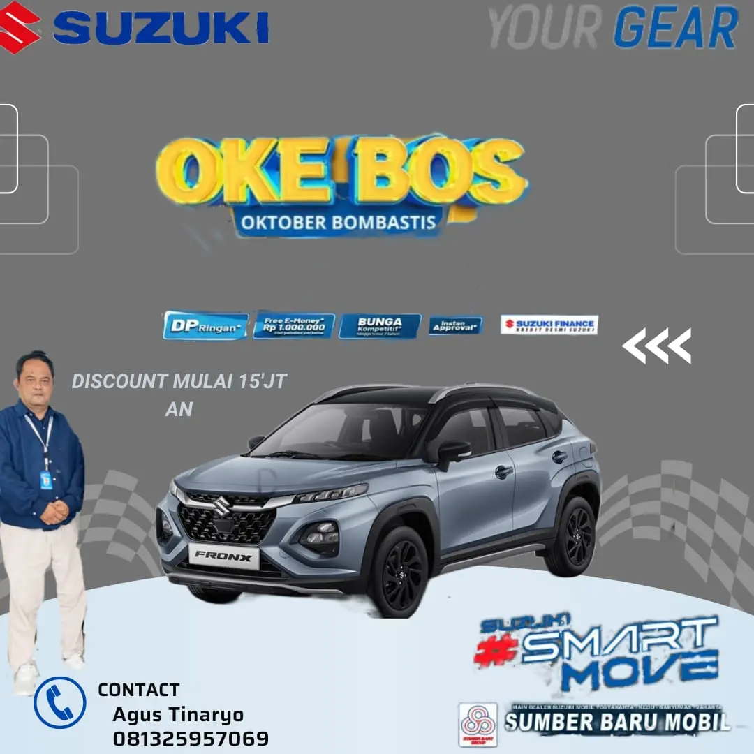 Warga Sleman, Yogyakarta, dan sekitarnya, siapkan diri Anda untuk kesempatan emas di bulan Oktober ini! Suzuki Sumber Baru Mobil Mlati meluncurkan program promo paling heboh, yaitu "OKE BOS: Oktober Bombastis", khusus untuk Suzuki FRONX. Mobil Compact SUV bergaya coupe yang sedang naik daun ini kini bisa Anda bawa pulang dengan penawaran yang sulit ditolak: DISCOUNT MULAI 15 JUTA-AN!