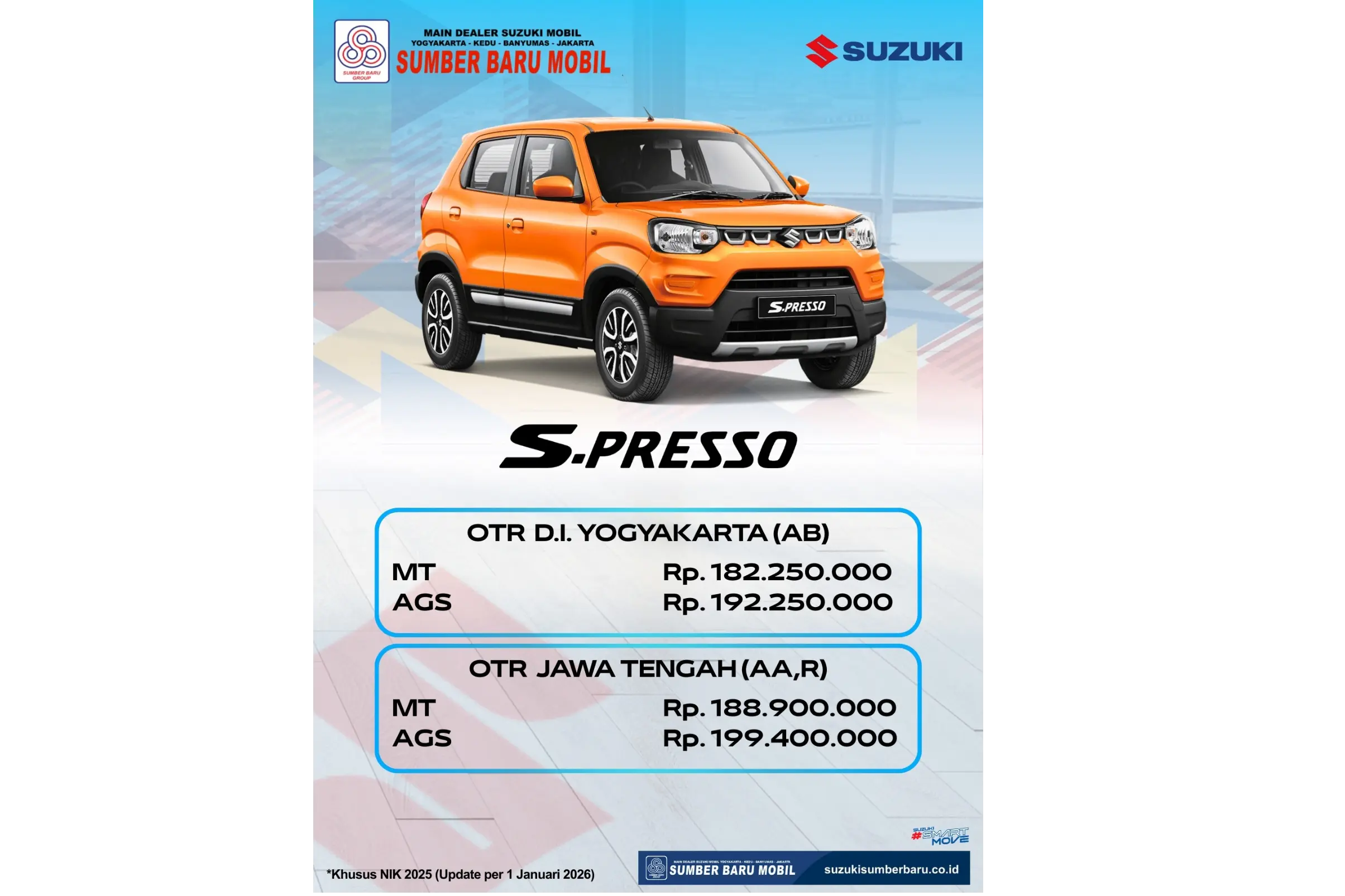 “S-Presso ini benar-benar menjawab kebutuhan saya. Iritnya luar biasa, buat jalanan nanjak ke kantor juga oke. Desainnya keren, gak kalah sama mobil mahal. Saya ambil di Suzuki Sumber Baru Mobil Wonosobo karena prosesnya cepat dan DP-nya beneran ringan sesuai iklan. Bonus Logam Mulia kemarin langsung saya jadikan investasi!”