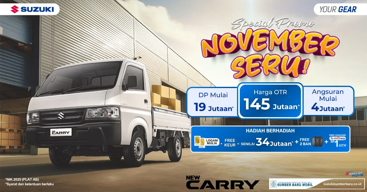 PURBALINGGA, SUZUKISUMBERBARU.CO.ID – Kabar gembira bagi para juragan dan pelaku usaha di Purbalingga dan sekitarnya! Di pertengahan bulan ini, Dealer Suzuki Purbalingga (Sumber Baru Mobil) secara resmi merilis program "SPECIAL PROMO NOVEMBER SERU!" khusus untuk armada bisnis andalan, New Suzuki Carry Pick-Up.