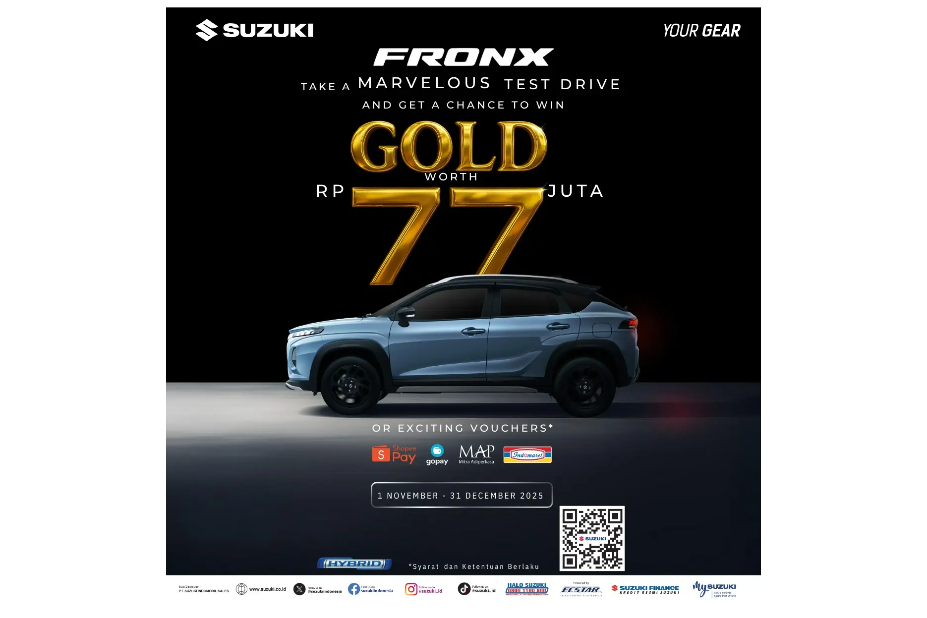 Promo 'Agustus Merdeka!' mencakup berbagai model unggulan Suzuki yang paling diminati. Suzuki XL7 hadir sebagai mobil SUV tangguh dengan tampilan sporty dan interior lega, cocok untuk petualangan keluarga. Suzuki Fronx, dengan desain crossover yang modern, siap menemani aktivitas harian Anda di perkotaan. Sementara itu, All New Ertiga tetap menjadi pilihan favorit keluarga dengan kenyamanan dan efisiensi bahan bakar yang tak tertandingi. Seluruh jajaran mobil Suzuki lainnya juga tersedia dan dapat Anda pilih sesuai kebutuhan.