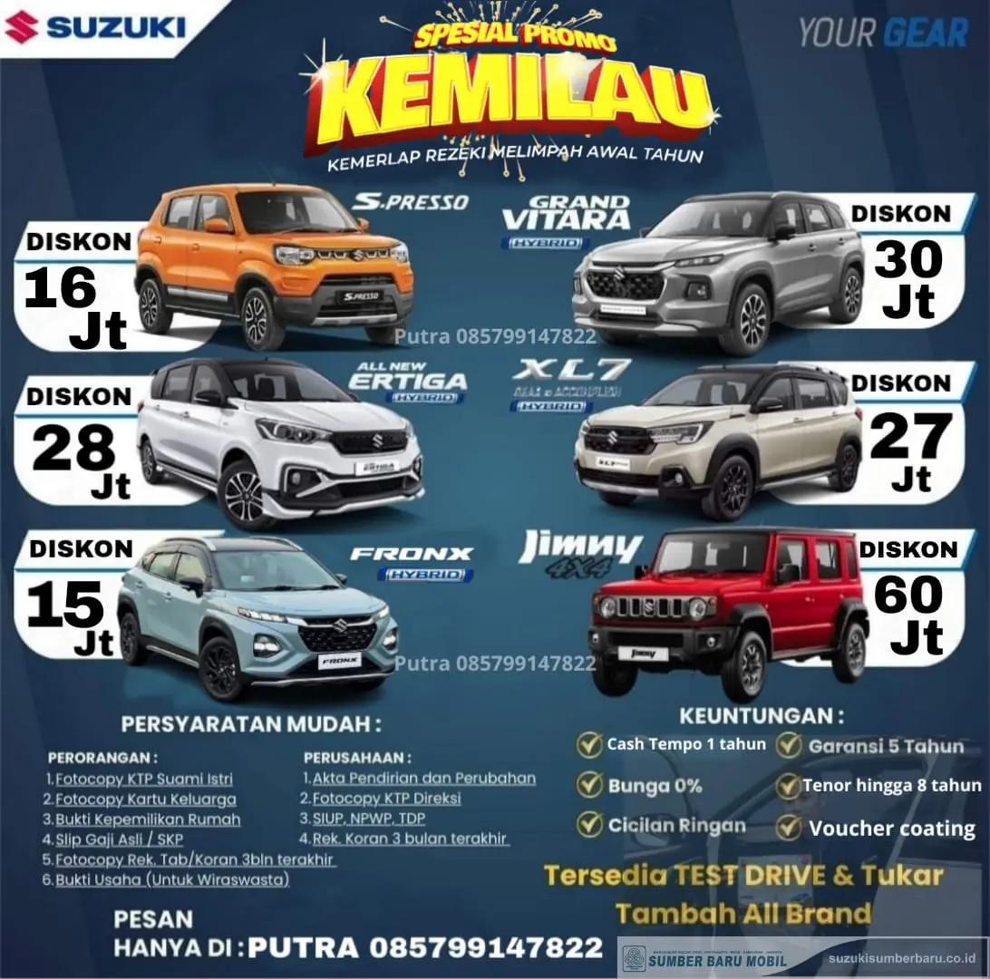Melalui promo ini, konsumen bisa menikmati diskon hingga 60 juta rupiah, bunga 0% selama 1 tahun, cash tempo 1 tahun, serta tenor kredit hingga 8 tahun. Menariknya, Suzuki juga menyediakan pembiayaan syariah, solusi aman dan nyaman tanpa riba.