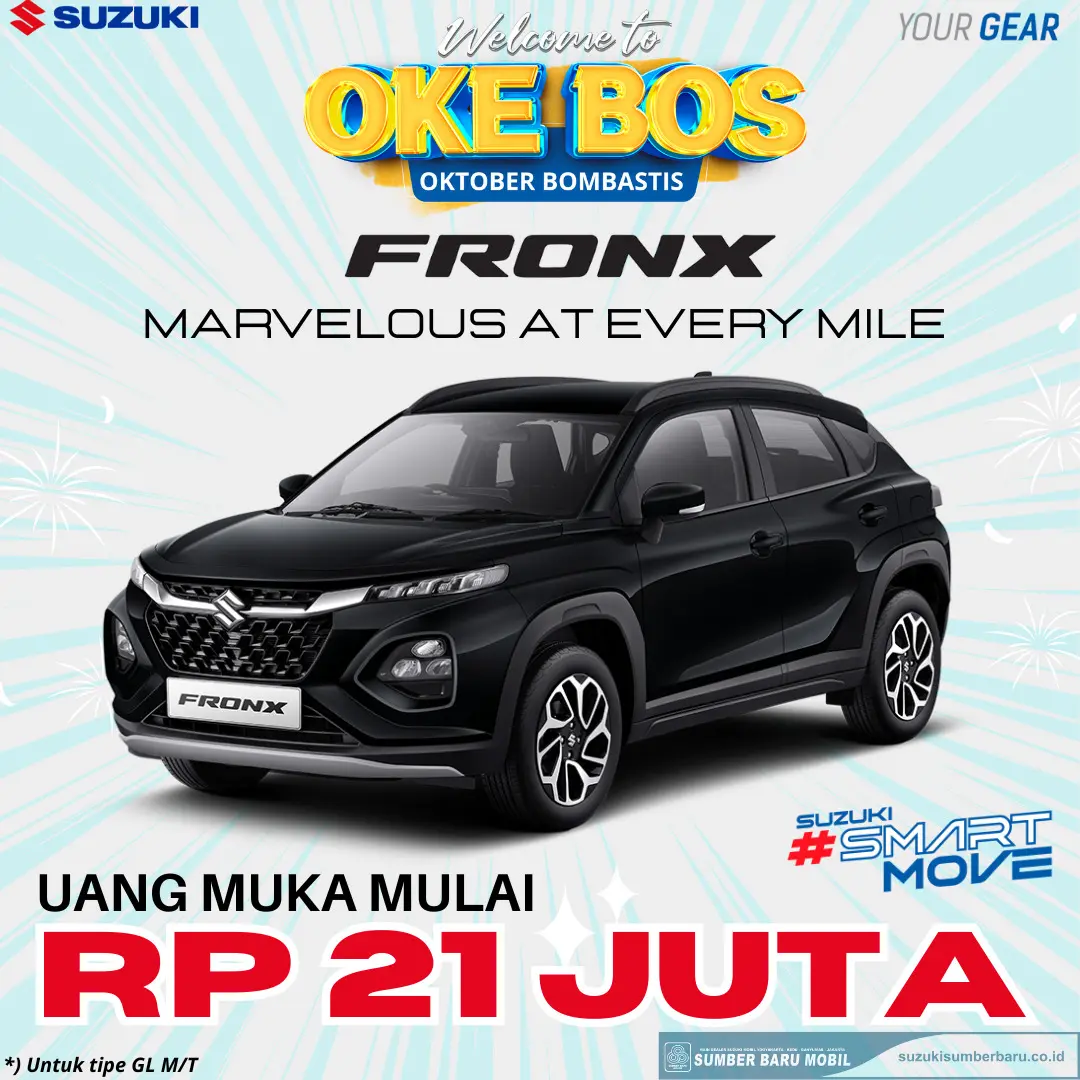 Lupakan semua rencana lama Anda, karena promo kali ini benar-benar di luar nalar. Sensasi terbaru di dunia otomotif, SUV Crossover paling stylish, Suzuki Fronx, kini bisa Anda bawa pulang dengan penawaran yang bikin heboh: Uang Muka (DP) mulai dari Rp 21 JUTA SAJA!