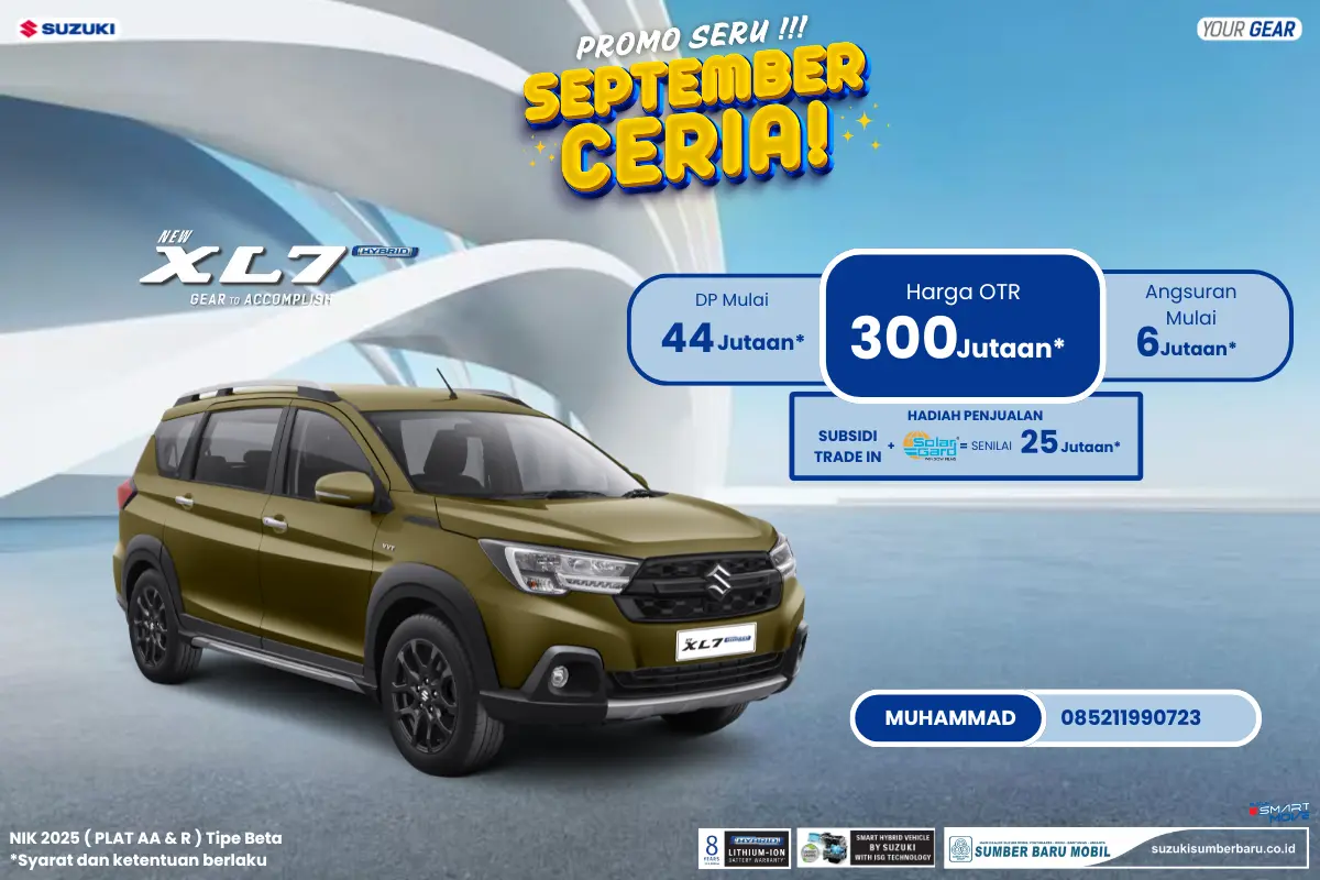 PURWOREJO — Kesempatan emas bagi Anda yang ingin punya mobil baru dengan teknologi canggih dan hemat bahan bakar! Suzuki Sumber Baru Mobil Purworejo kembali memberikan kejutan lewat promo September Ceria yang bikin dompet Anda makin bahagia. Kali ini, giliran Suzuki XL7 Hybrid yang jadi bintang utama dengan penawaran paling menarik.