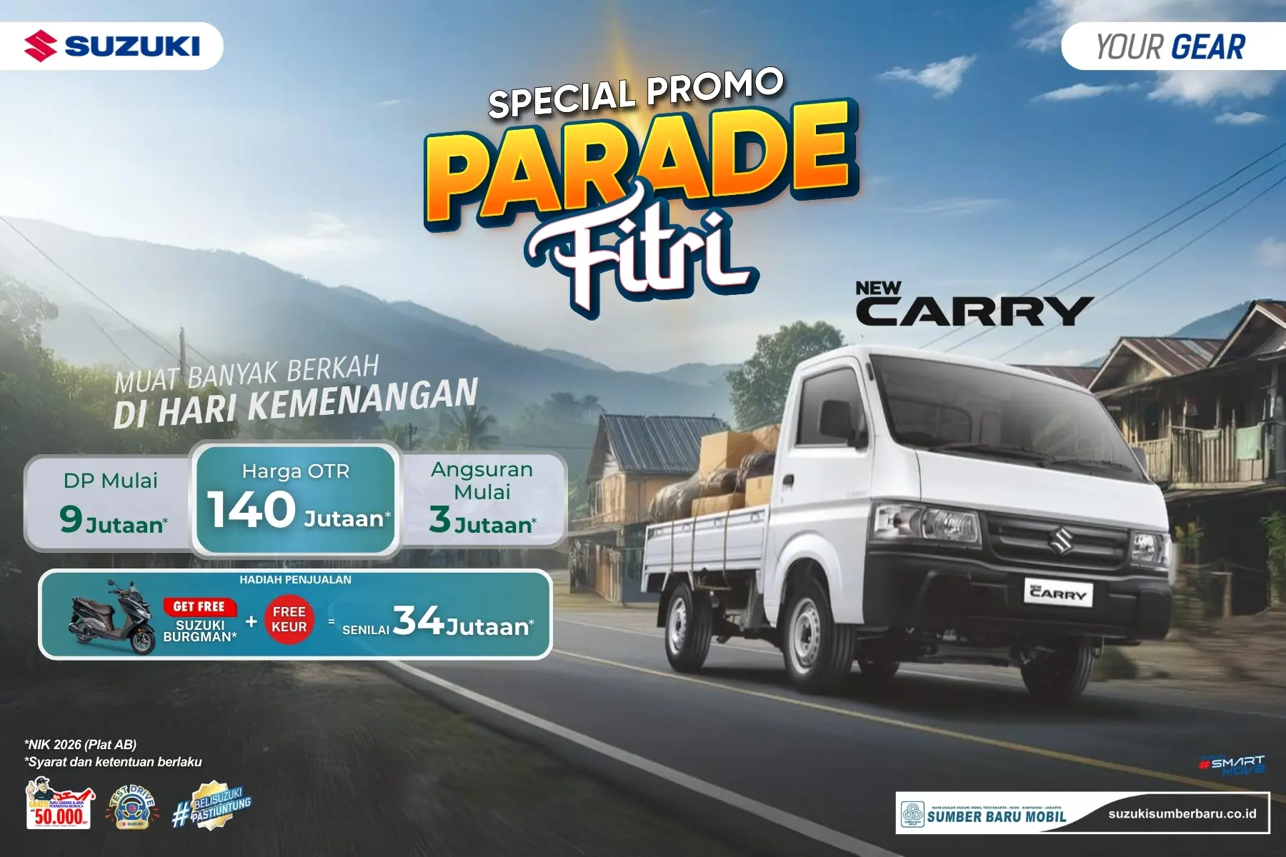 Promo Parade Fitri Suzuki Carry 2026 DP 9 Juta Gratis Burgman di Sumber Baru Mobil