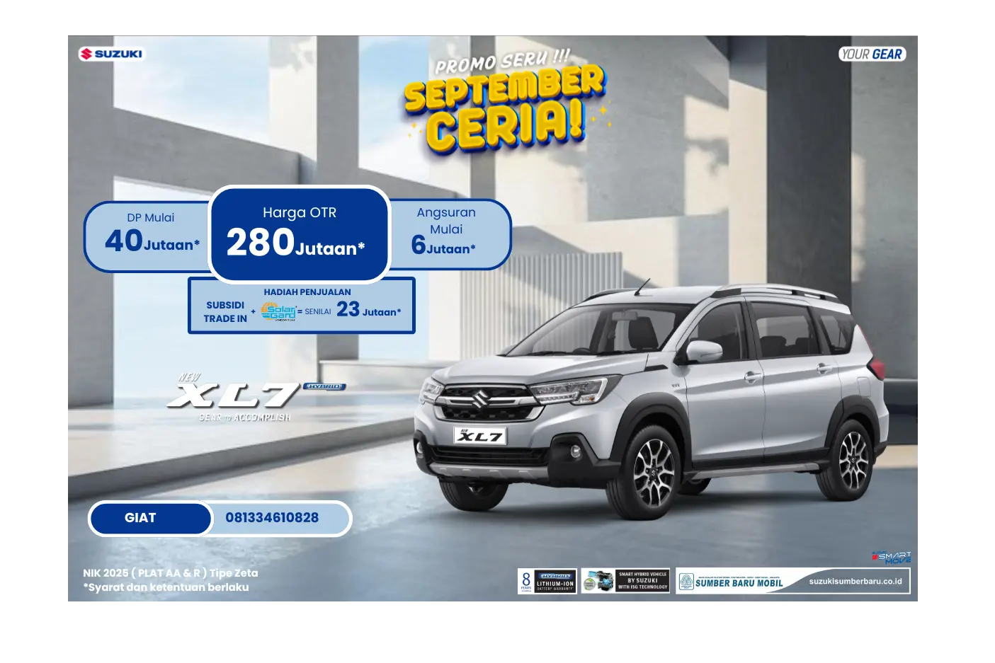 Promo September Ceria ini terbatas! Jangan sampai kesempatan emas ini terlewatkan. Segera kunjungi Dealer Suzuki Sumber Baru Mobil Bantul atau hubungi langsung marketing kami, Sulis, di 081328179202. Untuk informasi lengkap mengenai tipe dan harga, Anda juga bisa melihatnya di website resmi kami: https://suzukisumberbaru.co.id/.
