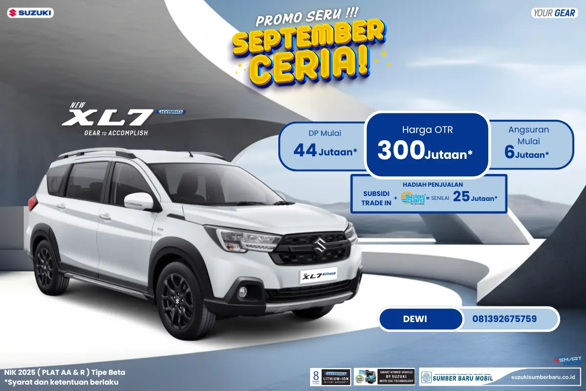 Suzuki Magelang Sumber Baru hadir dengan promo spesial September Ceria untuk kamu yang ingin punya mobil SUV stylish dan irit! Nikmati DP mulai 44 jutaan, harga OTR cuma 300 jutaan, dan angsuran ringan mulai 6 jutaan. Promo ini berlaku khusus tipe New XL7 Hybrid NIK 2025 plat AA & R.