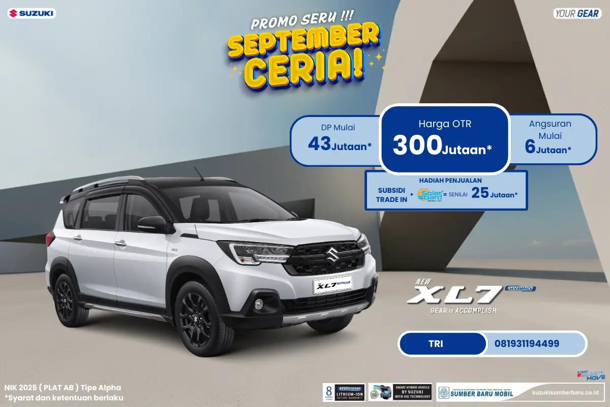 Bulan September ini, Suzuki Sumber Baru Mobil Mlati hadirkan Promo September Ceria untuk Suzuki XL7 Hybrid—mobil SUV keluarga yang stylish dan hemat bahan bakar berkat teknologi hybrid terbaru. Nikmati kemudahan memiliki XL7 dengan DP mulai 43 Jutaan dan cicilan ringan hanya dari 6 Jutaan saja. Harga OTR resmi hanya 300 Jutaan!*