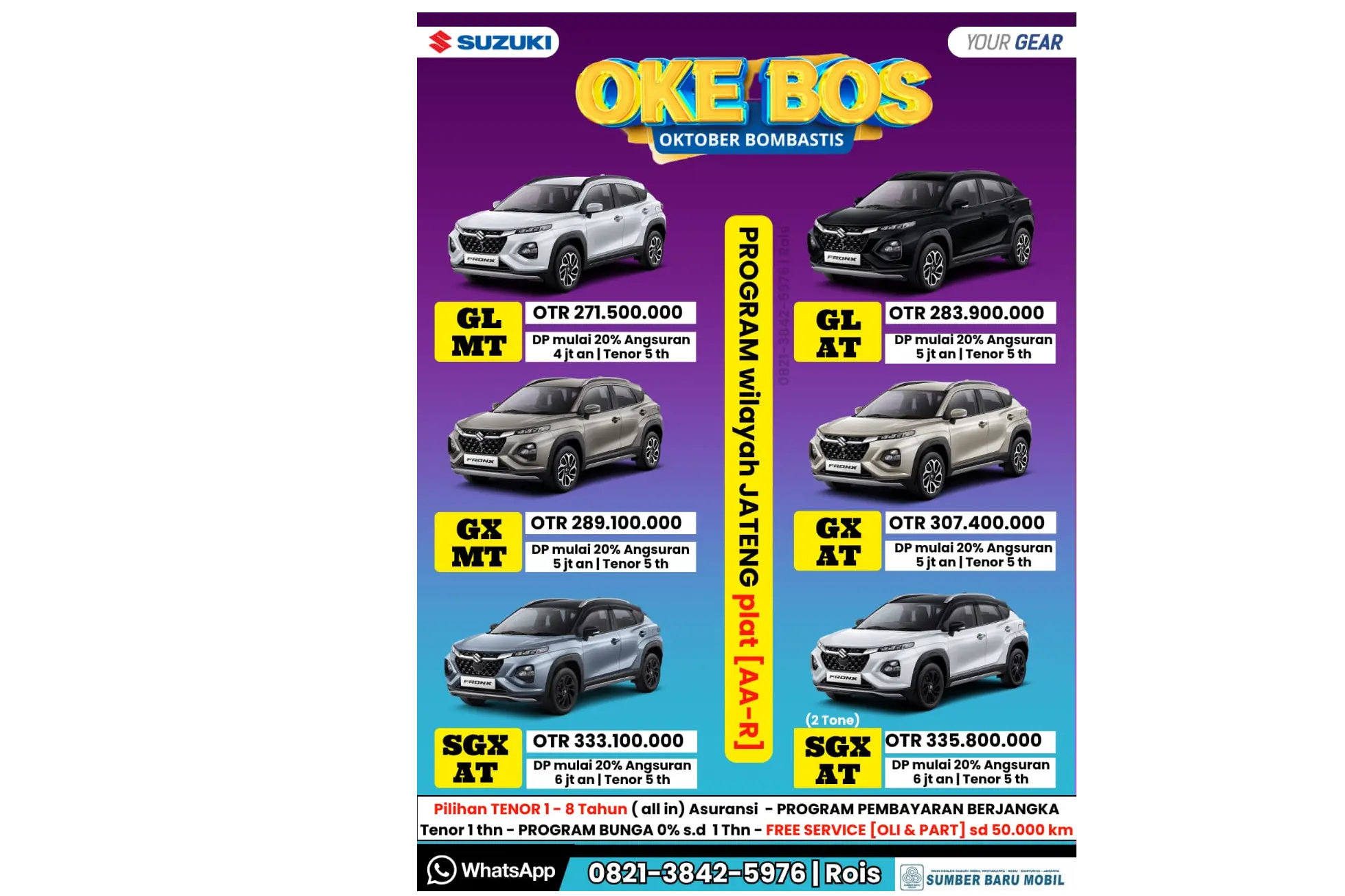 Tak hanya itu, tersedia pula pilihan tenor hingga 8 tahun, cocok untuk kamu yang menginginkan cicilan ringan dan jangka panjang. Untuk kamu yang lebih suka opsi fleksibel, Suzuki juga menyediakan skema pembayaran Cash Tempo 50:50 yang bisa disesuaikan dengan kebutuhan finansialmu.