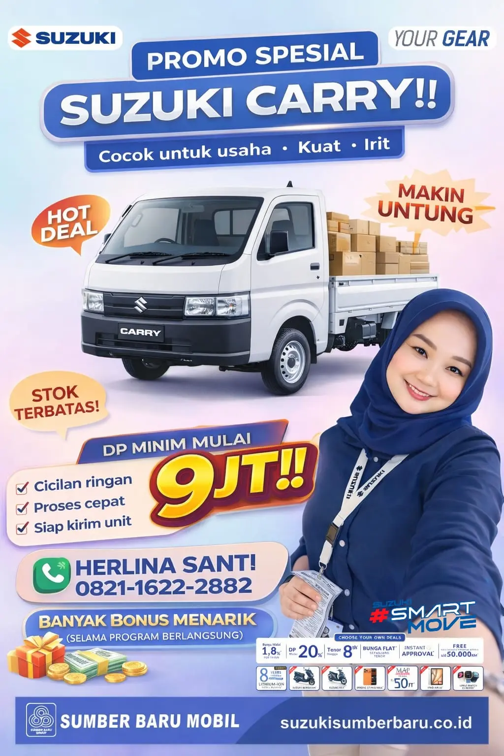 "Awalnya ragu mau tambah mobil karena modal mepet. Tapi setelah ke Suzuki Sumber Baru Mobil Bantul dan ketemu Mbak Herlina, ternyata DP 9 juta beneran bisa jalan! Prosesnya cuma hitungan hari, unit langsung dikirim ke rumah. Sekarang kirim barang makin lancar," > — Pak Slamet, Pengusaha Sembako di Bantul.