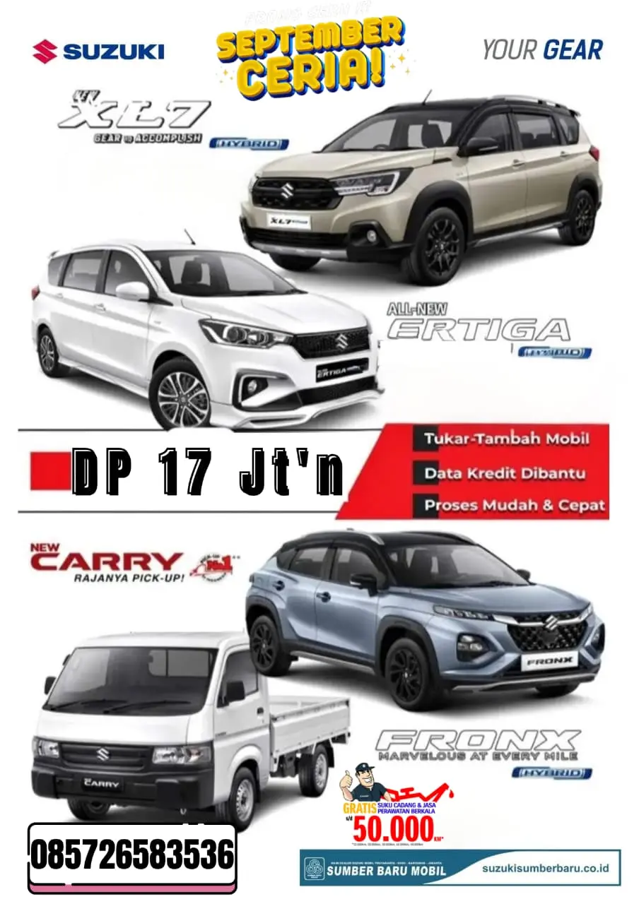 Untuk informasi lebih lanjut dan konsultasi gratis, segera hubungi nomor yang tertera: 085726583536. Kunjungi juga website resmi kami di https://suzukisumberbaru.co.id/ untuk melihat semua pilihan mobil dan promo menarik lainnya