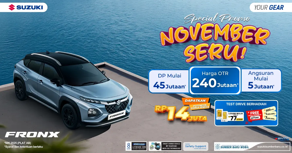 Promo ini menjadi salah satu yang paling diburu konsumen karena menghadirkan paket pembelian yang sangat terjangkau—mulai dari DP 45 jutaan, harga OTR 240 jutaan, dan angsuran 5 jutaan. Tidak hanya itu, Suzuki juga memberikan potongan harga hingga 14 juta rupiah untuk pembelian unit FRONX NIK 2025.
