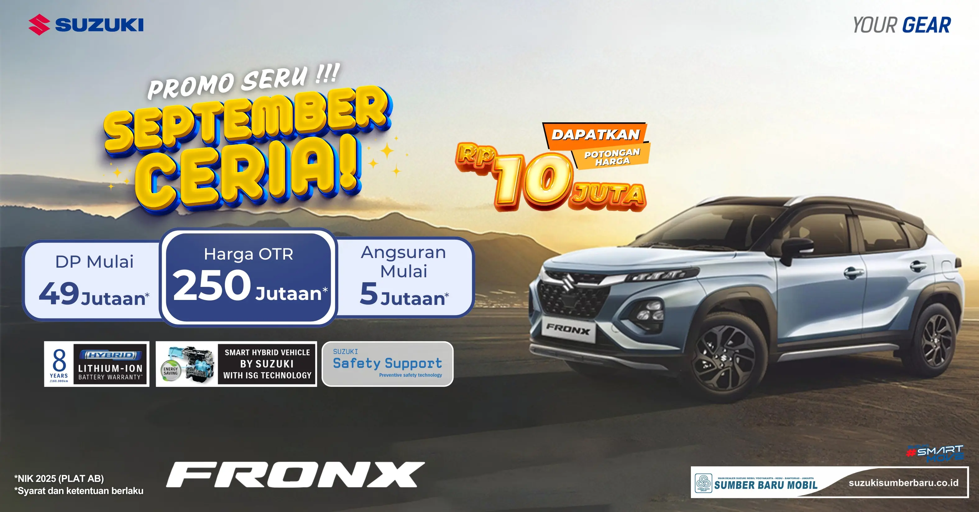 Jogja, Kedu, Banyumas, hingga Magelang – Kabar gembira datang untuk Anda pecinta otomotif! Suzuki menghadirkan promo spesial “September Ceria 2025” untuk Suzuki FRONX, mobil SUV stylish yang kini jadi primadona keluarga muda maupun profesional.