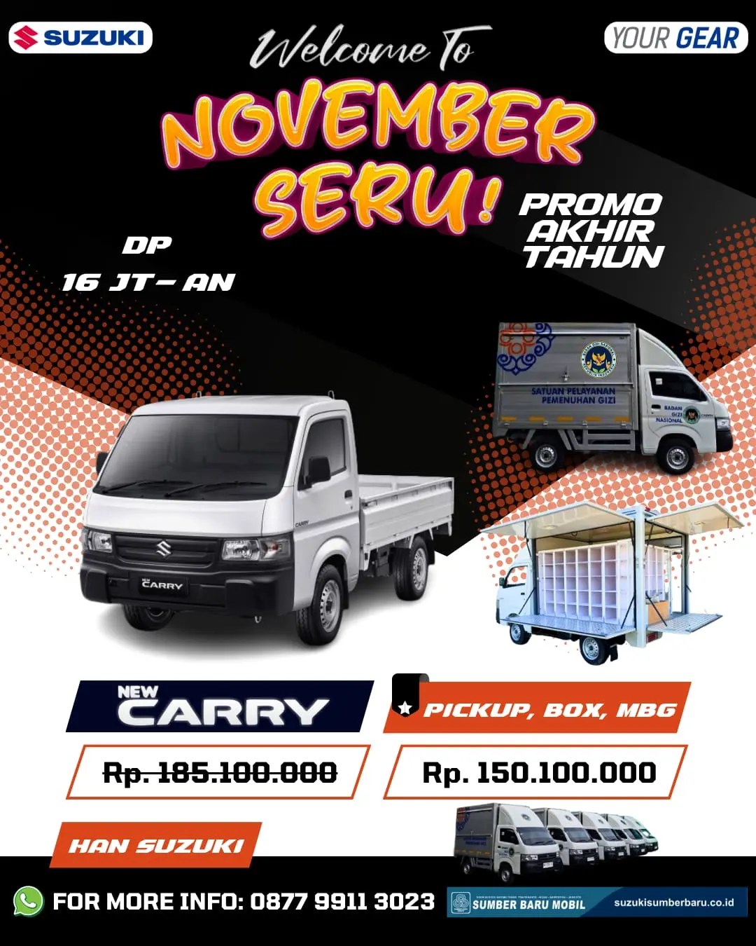Promo spesial ini memberikan kesempatan emas memiliki Suzuki New Carry hanya dengan DP mulai 16 jutaan dan harga mulai Rp 150.100.000.