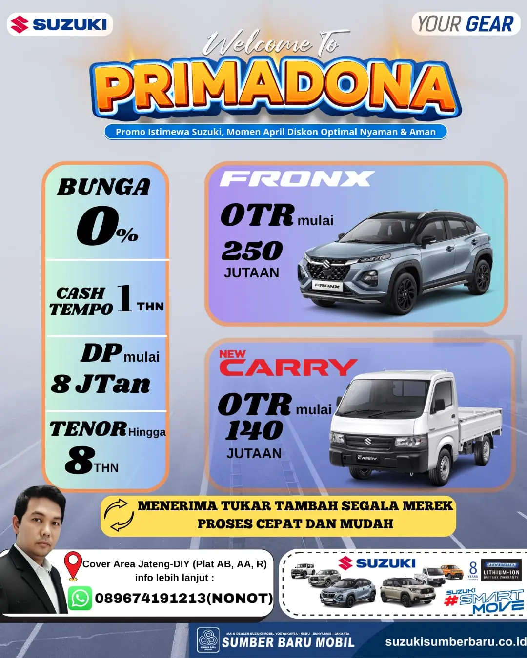 "Awalnya ragu mau ambil unit karena budget pas-pasan, tapi setelah konsultasi di Suzuki Sumber Baru Mobil, ternyata DP 8 juta sudah bisa bawa pulang unit. Prosesnya cepat, dibantu sampai approve. Terima kasih Mas Nonot!" — Bapak Slamet, Pengusaha di Bantul.