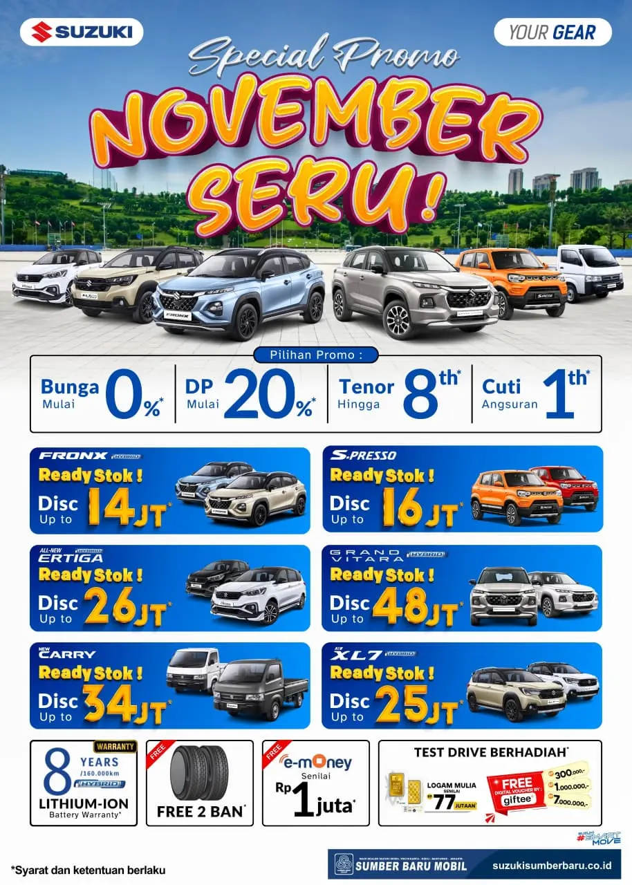 Yogyakarta, 20 November 2025 – Waktunya ganti mobil baru! Bagi Anda warga Yogyakarta (terutama wilayah Mlati, Sleman, dan sekitarnya), Suzuki Mlati Sumber Baru Mobil (Dealer resmi Suzuki di area Jogja) kembali menghadirkan promo paling ditunggu di penghujung tahun: "Suzuki November SERU!"