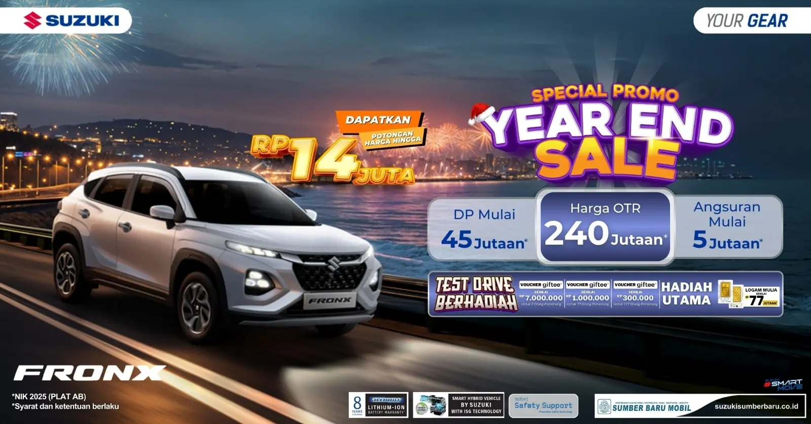 "Saya cari mobil buat operasional usaha yang gesit masuk gang tapi tetap gaya buat ketemu klien. Suzuki Fronx ini pas banget ukurannya. Apalagi ada diskon 14 juta di akhir tahun, lumayan banget buat tambahan modal usaha. Angsuran 5 juta juga ringan," ungkap Gilang.